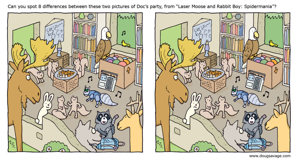 Here’s an image from my new book, Laser Moose and Rabbit Boy: Spidermania, which is in stores TODAY!! This party at Doc’s place happens early in the book before things get really crazy. Can you spot the 8 differences between these two pictures? (Click here to see a larger version!)